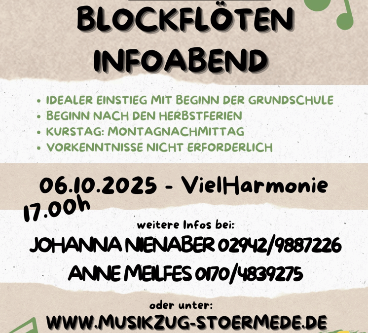 24. September 2025Der Musikzug Störmede lädt alle interessierten Kinder und Eltern herzlich zum Infoabend rund um den Blockflötenkurs ein!